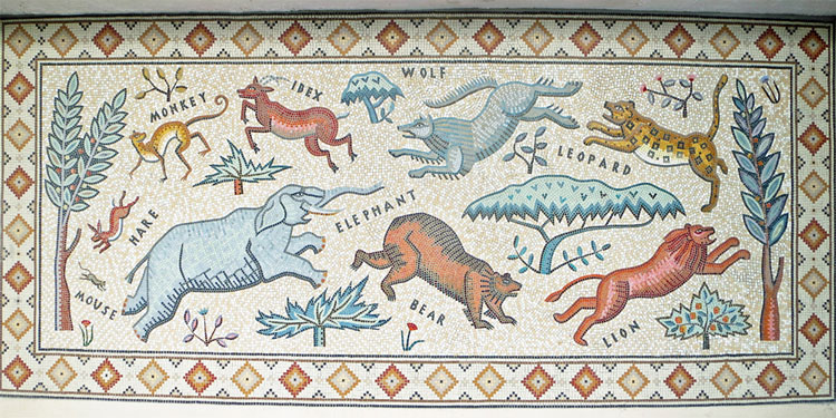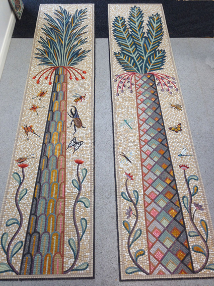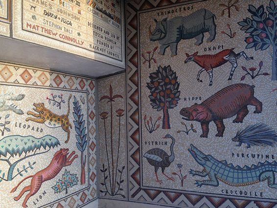 HACKNEY DOWNS MOSAICS The designs were inspired by the mosaics of Jordan and the Middle East. The lively and economical style lent itself well to a project made by volunteers and their hard work and dedication exceeded all my expectations. Click on each image for a larger version. |